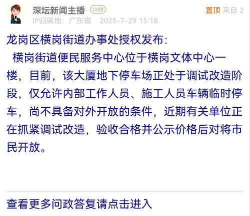 橫崗街道便民服務(wù)中心位于橫崗文體中心一樓,目前,該大廈地下停車(chē)場(chǎng)正處于調(diào)試改造階段,僅允許內(nèi)部工作人員、施工人員車(chē)輛臨時(shí)停車(chē),尚不具備對(duì)外開(kāi)放的條件,近期有關(guān)單位正在抓緊調(diào)試改造,驗(yàn)收合格并公示價(jià)格后對(duì)將市民開(kāi)放。