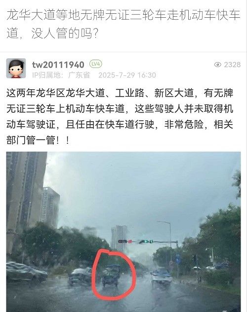 6. 帖文《龍華大道等地?zé)o牌無(wú)證三輪車(chē)走機(jī)動(dòng)車(chē)快車(chē)道,沒(méi)人管的嗎?》