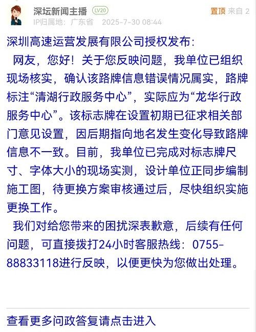 網(wǎng)友,您好!關(guān)于您反映問(wèn)題,我單位已組織現(xiàn)場(chǎng)核實(shí),確認(rèn)該路牌信息錯(cuò)誤情況屬實(shí),路牌標(biāo)注“清湖行政服務(wù)中心”,實(shí)際應(yīng)為“龍華行政服務(wù)中心”。該標(biāo)志牌在設(shè)置初期已征求相關(guān)部門(mén)意見(jiàn)設(shè)置,因后期指向地名發(fā)生變化導(dǎo)致路牌信息不一致。目前,我單位已完成對(duì)標(biāo)志牌尺寸、字體大小的現(xiàn)場(chǎng)實(shí)測(cè),設(shè)計(jì)單位正同步編制施工圖,待更換方案審核通過(guò)后,盡快組織實(shí)施更換工作。