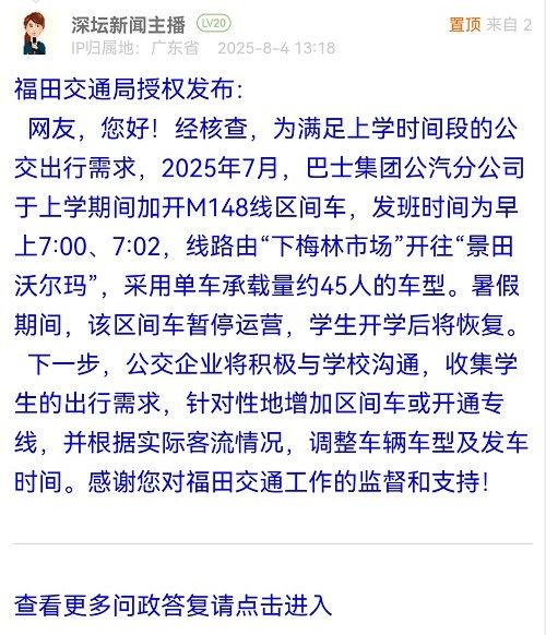 下一步,公交企業(yè)將積極與學(xué)校溝通,收集學(xué)生的出行需求,針對(duì)性地增加區(qū)間車(chē)或開(kāi)通專(zhuān)線,并根據(jù)實(shí)際客流情況,調(diào)整車(chē)輛車(chē)型及發(fā)車(chē)時(shí)間。感謝您對(duì)福田交通工作的監(jiān)督和支持!