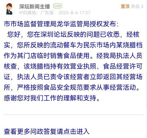 您好,您在深圳論壇反映的問(wèn)題已收悉,經(jīng)核實(shí),您所反映的流動(dòng)餐車(chē)為民樂(lè)市場(chǎng)內(nèi)某燒臘檔作為其門(mén)店臨時(shí)銷(xiāo)售食品使用。經(jīng)我局執(zhí)法人員核查,該燒臘檔持有效營(yíng)業(yè)執(zhí)照、食品經(jīng)營(yíng)許可證,執(zhí)法人員已責(zé)令該經(jīng)營(yíng)者立即返回其經(jīng)營(yíng)場(chǎng)所,嚴(yán)格按照食品安全規(guī)范要求從事經(jīng)營(yíng)活動(dòng)。感謝您對(duì)我們工作的理解和支持。