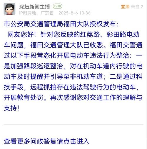網(wǎng)友您好!針對(duì)您反映的紅荔路、彩田路電動(dòng)車(chē)問(wèn)題,福田交通管理大隊(duì)已收悉。福田交警通過(guò)以下手段常態(tài)化開(kāi)展電動(dòng)車(chē)違法行為整治:一是加強(qiáng)路段巡邏整治,對(duì)在機(jī)動(dòng)車(chē)道內(nèi)行駛的電動(dòng)車(chē)及時(shí)提醒并引導(dǎo)至非機(jī)動(dòng)車(chē)道;二是通過(guò)科技手段,遠(yuǎn)程抓拍存在違法駕駛行為的電動(dòng)車(chē),開(kāi)展教育處罰。再次感謝您對(duì)交通工作的理解與支持!
