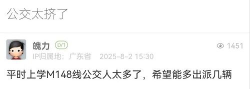 網(wǎng)友,您好!經(jīng)核查,為滿足上學(xué)時(shí)間段的公交出行需求,2025年7月,巴士集團(tuán)公汽分公司于上學(xué)期間加開(kāi)M148線區(qū)間車(chē),發(fā)班時(shí)間為早上7:00、7:02,線路由“下梅林市場(chǎng)”開(kāi)往“景田沃爾瑪”,采用單車(chē)承載量約45人的車(chē)型。暑假期間,該區(qū)間車(chē)暫停運(yùn)營(yíng),學(xué)生開(kāi)學(xué)后將恢復(fù)。