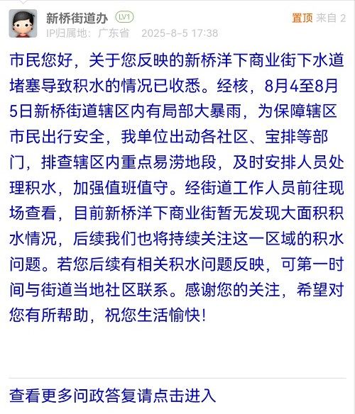 市民您好,關(guān)于您反映的新橋洋下商業(yè)街下水道堵塞導(dǎo)致積水的情況已收悉。經(jīng)核,8月4至8月5日新橋街道轄區(qū)內(nèi)有局部大暴雨,為保障轄區(qū)市民出行安全,我單位出動(dòng)各社區(qū)、寶排等部門,排查轄區(qū)內(nèi)重點(diǎn)易澇地段,及時(shí)安排人員處理積水,加強(qiáng)值班值守。經(jīng)街道工作人員前往現(xiàn)場(chǎng)查看,目前新橋洋下商業(yè)街暫無(wú)發(fā)現(xiàn)大面積積水情況,后續(xù)我們也將持續(xù)關(guān)注這一區(qū)域的積水問題。若您后續(xù)有相關(guān)積水問題反映,可第一時(shí)間與街道當(dāng)?shù)厣鐓^(qū)聯(lián)系。感謝您的關(guān)注,希望對(duì)您有所幫助,祝您生活愉快!