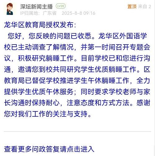 您好,您反映的問題已收悉。龍華區(qū)外國(guó)語(yǔ)學(xué)校已主動(dòng)調(diào)查了解情況,并第一時(shí)間召開專題會(huì)議,積極研究躺睡工作。目前學(xué)校已和您進(jìn)行溝通,邀請(qǐng)您到校共同研究學(xué)生優(yōu)質(zhì)躺睡工作。區(qū)教育局已督促學(xué)校推進(jìn)學(xué)生午休躺睡工作,全力提供學(xué)生優(yōu)質(zhì)午休服務(wù);同時(shí)要求學(xué)校老師與家長(zhǎng)溝通時(shí)保持耐心,注意態(tài)度和方式方法。感謝您對(duì)我們工作的關(guān)注與支持。