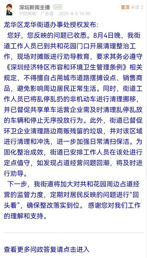 您好,您反映的問題已收悉。8月4日晚,我街道工作人員已到共和花園門口開展清理整治工作,現(xiàn)場(chǎng)對(duì)攤販進(jìn)行勸導(dǎo)教育,要求其務(wù)必遵守《深圳經(jīng)濟(jì)特區(qū)市容和環(huán)境衛(wèi)生管理?xiàng)l例》相關(guān)規(guī)定,不得擅自占用城市道路擺攤設(shè)點(diǎn)、銷售商品,避免影響周邊居民正常生活。同時(shí),街道工作人員已將亂停亂扔的非機(jī)動(dòng)車進(jìn)行清理挪移,并已督促共享單車運(yùn)營(yíng)企業(yè)需及時(shí)清理亂停亂放的車輛和停止無(wú)序投放行為。此外,街道已督促環(huán)衛(wèi)企業(yè)清理路邊商販殘留的垃圾,并對(duì)該區(qū)域進(jìn)行清理和沖洗,進(jìn)一步加強(qiáng)日常清掃保潔。為固化整治成效,街道已安排工作人員在該處進(jìn)行定點(diǎn)值守,如發(fā)現(xiàn)占道經(jīng)營(yíng)問題回潮,將及時(shí)進(jìn)行勸導(dǎo)。