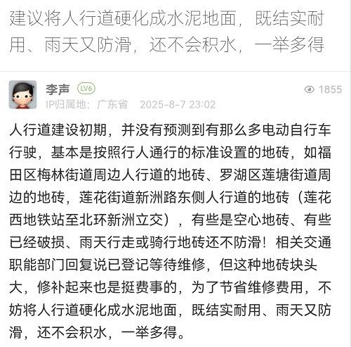 21. 帖文《建議將人行道硬化成水泥地面,既結(jié)實(shí)耐用、雨天又防滑,還不會(huì)積水,一舉多得》
