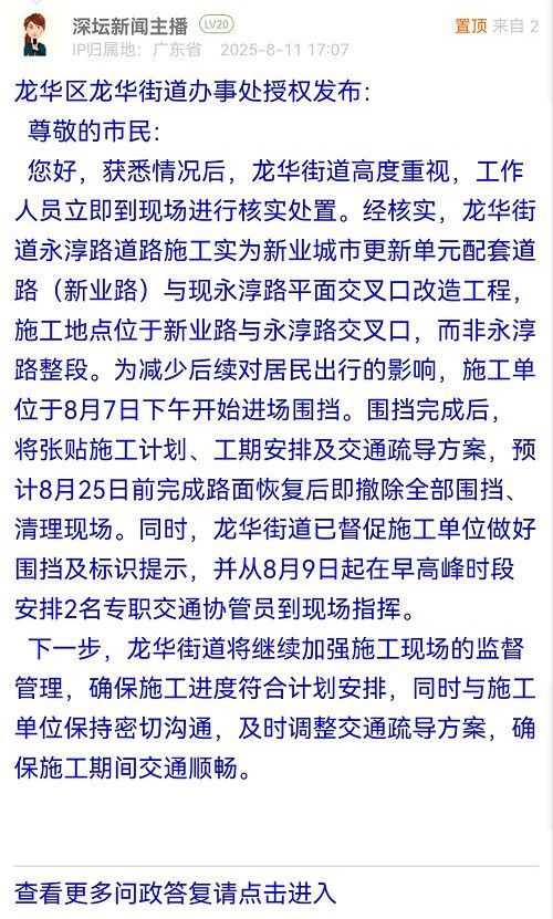 20. 帖文《龍華永淳路半幅道路被封無(wú)疏導(dǎo)》