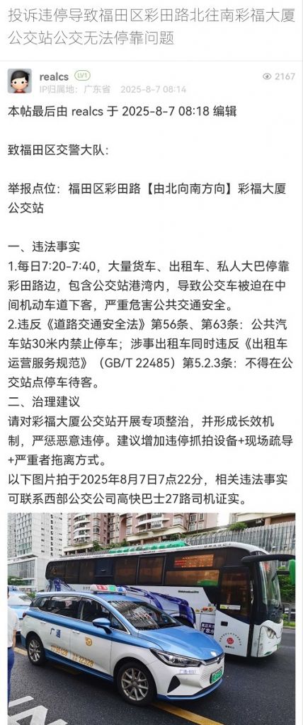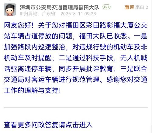 16. 帖文《投訴違停導(dǎo)致福田區(qū)彩田路北往南彩福大廈公交站公交無(wú)法??繂栴}》