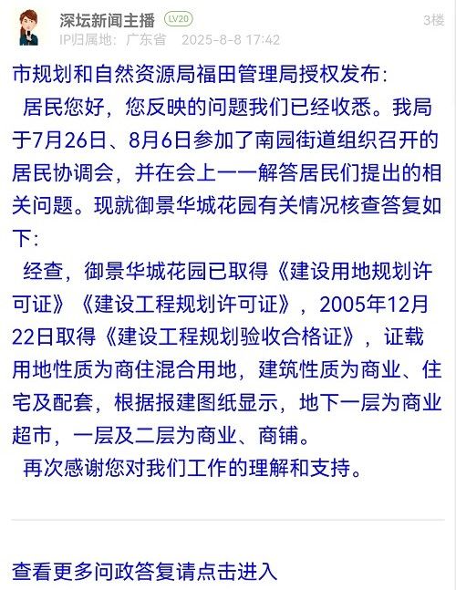 (二)關(guān)于“相關(guān)人員不作為”:自收到居民反對(duì)京基御景華城商業(yè)廣場(chǎng)改建手機(jī)維修市場(chǎng)的意見后,南園街道首先是成立了工作專班,第一時(shí)間介入處置。7月14日起多次約見京基公司和龍勝公司負(fù)責(zé)人,提醒其認(rèn)真考量商業(yè)規(guī)劃方案的可行性,積極探索更為妥善的商業(yè)方案,并于7月16日起開展現(xiàn)場(chǎng)走訪與檔案調(diào)閱工作,為后續(xù)解答居民問題做好準(zhǔn)備。其次是定向收集居民和商戶訴求,開展走訪座談。專班通過線下見面訪談、線上添加微信等方式,與業(yè)主代表建立聯(lián)系,其中街道掛點(diǎn)領(lǐng)導(dǎo)主動(dòng)加入樓棟微信群進(jìn)一步聽取大家的訴求意見。同時(shí)走訪商戶代表,詳細(xì)了解各商戶租約、經(jīng)營(yíng)現(xiàn)狀等情況,耐心聽取商戶核心訴求,告知工作進(jìn)展及下步計(jì)劃。此外,街道分別于7月18日、23日、26日及8月4日召開居民協(xié)調(diào)會(huì)、群眾接訪會(huì)和業(yè)主見面會(huì)等,針對(duì)大家關(guān)心的問題答疑解惑。然后是積極收集材料并研究政策法規(guī),協(xié)調(diào)相關(guān)部門深入探討。7月中下旬,街道多次組織區(qū)商務(wù)局、住建局、規(guī)自局、市監(jiān)局、消防大隊(duì)等相關(guān)單位共同研究居民訴求及相關(guān)問題清單,聯(lián)合回應(yīng)居民訴求(已于7月26日召開)。