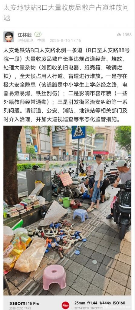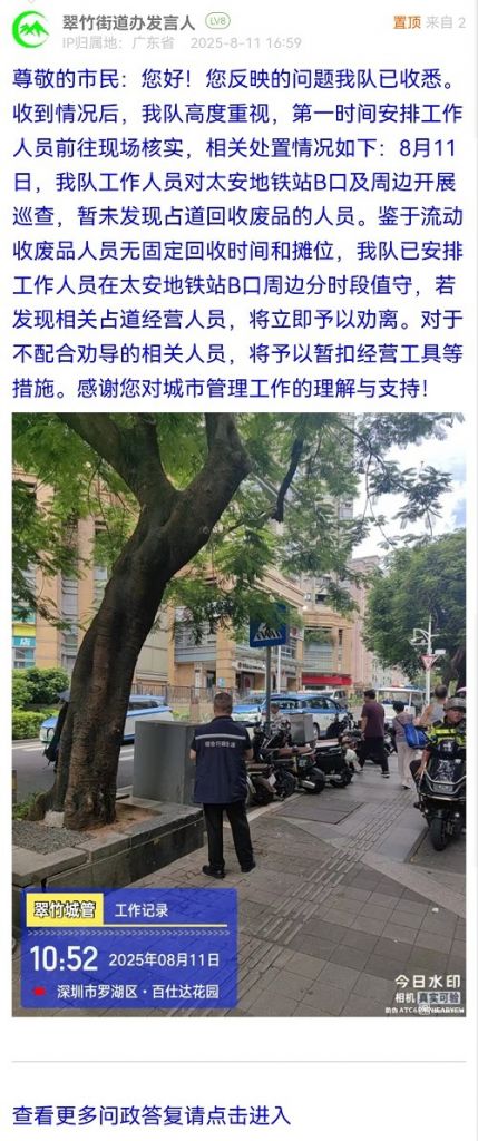 尊敬的市民:您好!您反映的問題我隊(duì)已收悉。收到情況后,我隊(duì)高度重視,第一時(shí)間安排工作人員前往現(xiàn)場(chǎng)核實(shí),相關(guān)處置情況如下:8月11日,我隊(duì)工作人員對(duì)太安地鐵站B口及周邊開展巡查,暫未發(fā)現(xiàn)占道回收廢品的人員。鑒于流動(dòng)收廢品人員無(wú)固定回收時(shí)間和攤位,我隊(duì)已安排工作人員在太安地鐵站B口周邊分時(shí)段值守,若發(fā)現(xiàn)相關(guān)占道經(jīng)營(yíng)人員,將立即予以勸離。對(duì)于不配合勸導(dǎo)的相關(guān)人員,將予以暫扣經(jīng)營(yíng)工具等措施。感謝您對(duì)城市管理工作的理解與支持!