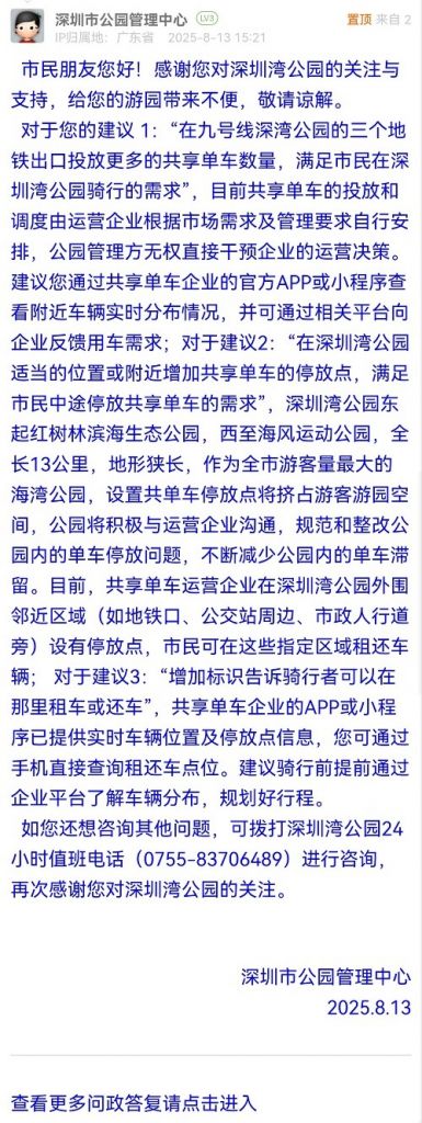 對(duì)于您的建議 1:“在九號(hào)線深灣公園的三個(gè)地鐵出口投放更多的共享單車數(shù)量,滿足市民在深圳灣公園騎行的需求”,目前共享單車的投放和調(diào)度由運(yùn)營(yíng)企業(yè)根據(jù)市場(chǎng)需求及管理要求自行安排,公園管理方無(wú)權(quán)直接干預(yù)企業(yè)的運(yùn)營(yíng)決策。建議您通過共享單車企業(yè)的官方APP或小程序查看附近車輛實(shí)時(shí)分布情況,并可通過相關(guān)平臺(tái)向企業(yè)反饋用車需求;對(duì)于建議2:“在深圳灣公園適當(dāng)?shù)奈恢没蚋浇黾庸蚕韱诬嚨耐7劈c(diǎn),滿足市民中途停放共享單車的需求”,深圳灣公園東起紅樹林濱海生態(tài)公園,西至海風(fēng)運(yùn)動(dòng)公園,全長(zhǎng)13公里,地形狹長(zhǎng),作為全市游客量最大的海灣公園,設(shè)置共單車停放點(diǎn)將擠占游客游園空間,公園將積極與運(yùn)營(yíng)企業(yè)溝通,規(guī)范和整改公園內(nèi)的單車停放問題,不斷減少公園內(nèi)的單車滯留。目前,共享單車運(yùn)營(yíng)企業(yè)在深圳灣公園外圍鄰近區(qū)域(如地鐵口、公交站周邊、市政人行道旁)設(shè)有停放點(diǎn),市民可在這些指定區(qū)域租還車輛; 對(duì)于建議3:“增加標(biāo)識(shí)告訴騎行者可以在那里租車或還車”,共享單車企業(yè)的APP或小程序已提供實(shí)時(shí)車輛位置及停放點(diǎn)信息,您可通過手機(jī)直接查詢租還車點(diǎn)位。建議騎行前提前通過企業(yè)平臺(tái)了解車輛分布,規(guī)劃好行程。