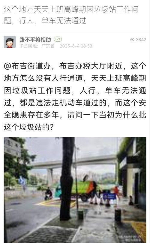 1. 帖文《這個(gè)地方天天上班高峰期因垃圾站工作問題,行人,單車無(wú)法通過》