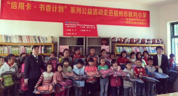 2016年,由深圳農(nóng)商行發(fā)起的“信用卡公益計(jì)劃·書香圖書室”捐贈(zèng)活動(dòng),深入走進(jìn)廣西壯族自治區(qū)的偏遠(yuǎn)山區(qū),為當(dāng)?shù)剌^為貧困的學(xué)校學(xué)生送去溫暖。此次活動(dòng)為當(dāng)?shù)氐闹写逍W(xué)、合林小學(xué)及龍降小學(xué)捐贈(zèng)各類圖書共計(jì)2217本、文具6665套、書包153個(gè)、書桌書柜椅子共115個(gè)、體育用品108套,有效地幫助這三所小學(xué)建設(shè)完整的圖書室,為學(xué)生們創(chuàng)造良好的閱讀環(huán)境。[詳細(xì)]